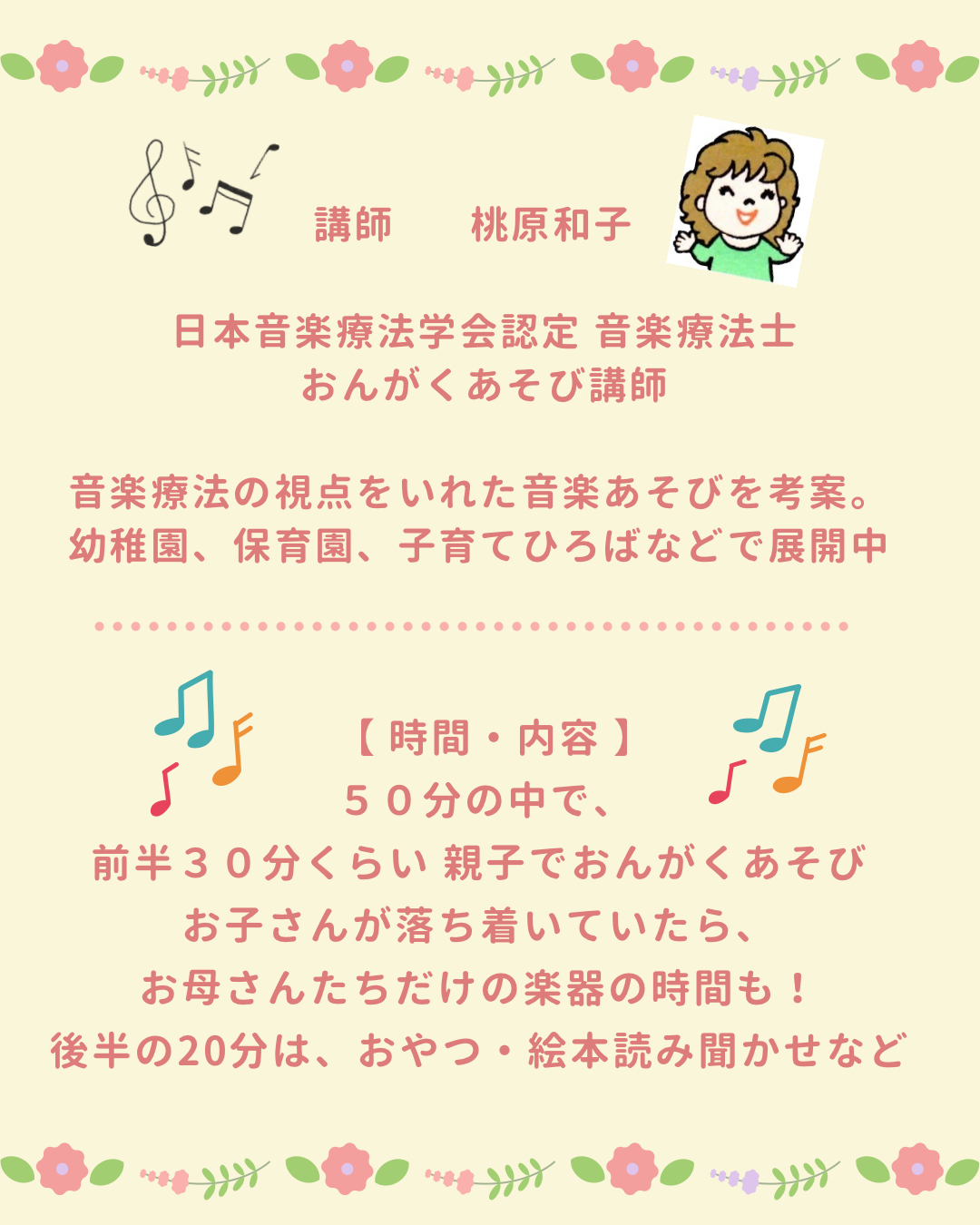 桃原和子 日本音楽療法学会認定 音楽療法士/おんがくあそび講師 音楽療法の視点をいれた音楽あそびを考案 幼稚園、保育園、子育てひろばなどで展開中 |
