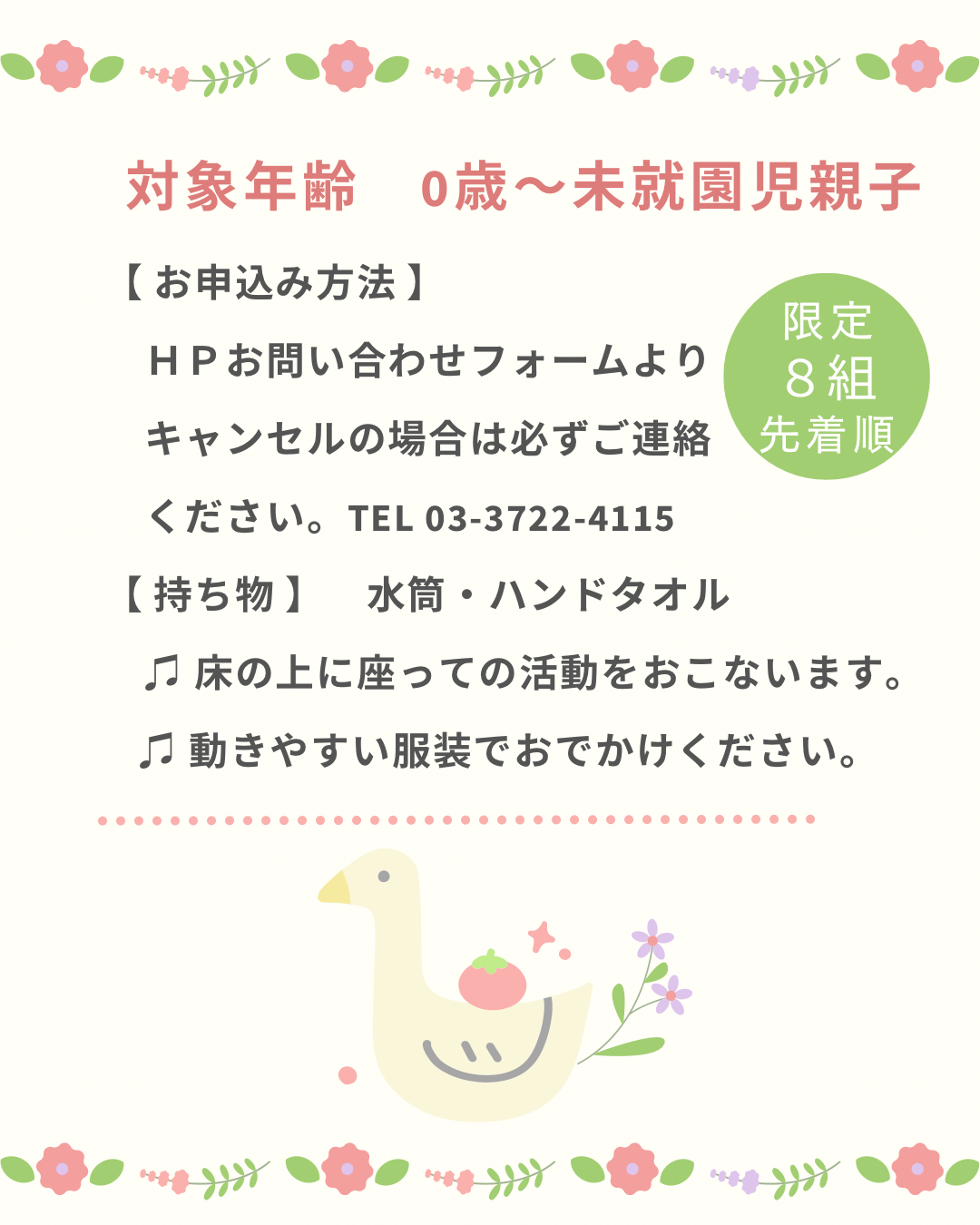 ホームページお問い合わせフォームよりお申込みください。 開催日1ヶ月前より受付 締切:開催日当日の朝10時まで ※キャンセルをされる場合は必ずご連絡ください。TEL 03-3722-4115 |